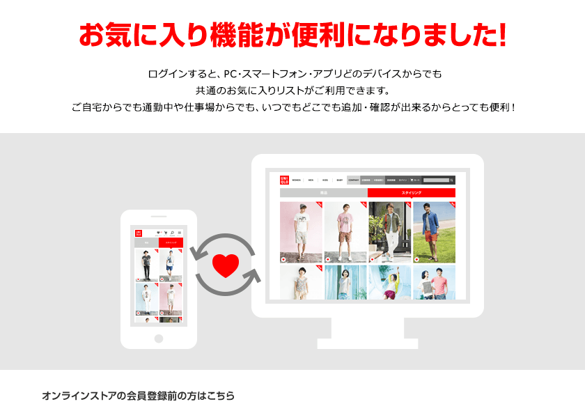 ログインすると、ユニクロアプリや他の端末からでも共通のお気に入りリストがご利用できます。