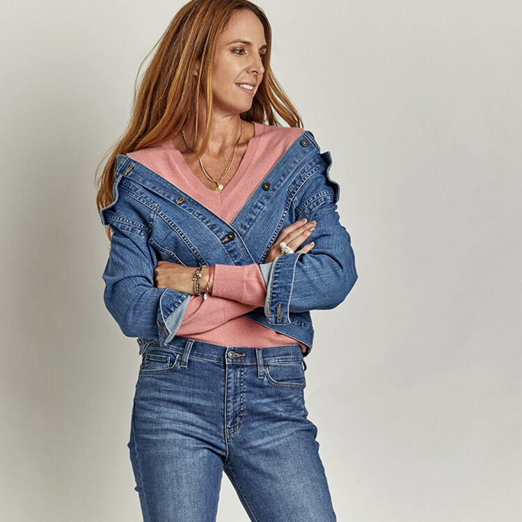 Wearing denim is so easy day or night – but by adding some colour, like this pink cashmere knit really adds something to your denim staples. You can play around with how you style your denim jacket, buy buttoning it off the shoulder or tying it around your waist.