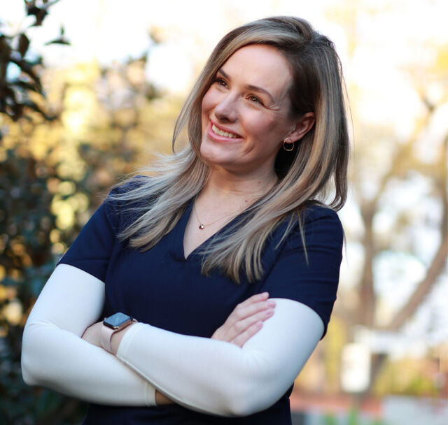 Dr Nikki Stamp wears Women’s HEATTECH Bra Scoop Neck T-Shirt underneath her scrubs.