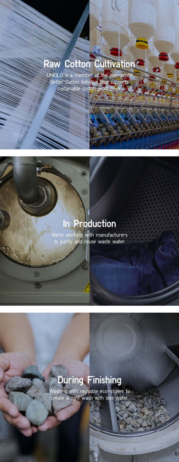 Jeans are in the midst of a significant change. To reduce the amount of water used in the production of denim, we have adopted state-of-the-art technologies. Vintage processing methods are now accomplished using new more sustainable technology, such as lasers to apply whiskering, and eco stones for distressing. We will continue to look for ways to improve sustainability while keeping the look of the jeans you love.What We're Doing Now