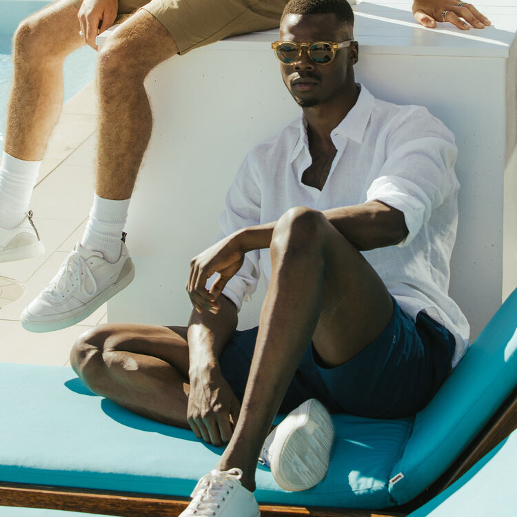 We’re heading poolside for simple style and light layering. A pastel blue or navy shirt unbuttoned over a classic white crew tee brings the desirable relaxed, holiday vibes. Speaking of navy, the linen shorts are also available in this darker tone which works really well with your choice of pastel or neutral-coloured shirts. Add your favourite pair of shades and take it easy by the water while decked-out in light linen. Footwear is optional and don’t forget your towel!