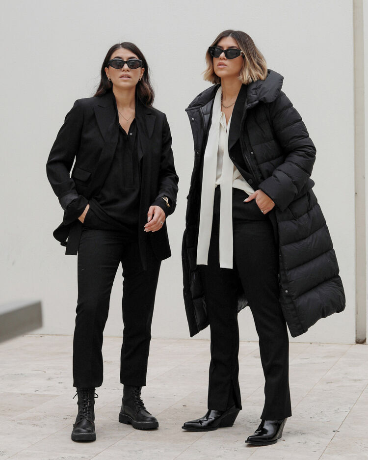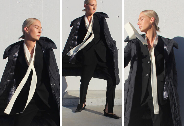 @jessicajroche wears the +J Ultra Light Down Hooded Coat, +J Wool Tailored Jacket, +J Silk Gathered Long Sleeve Blouse and +J Wool Silm Pants.