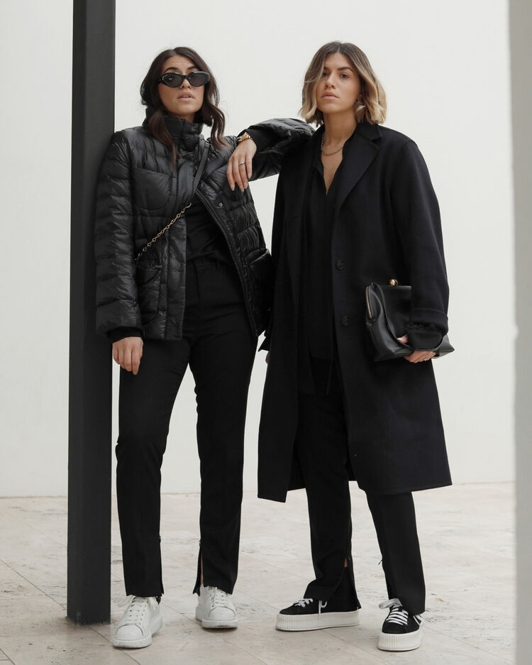 @laurennburns wears the +J Ultra Light Down Hooded Coat, +J Wool Tailored Coat, +J Silk Gathered Long Sleeve Blouse and +J Wool Silm Pants.