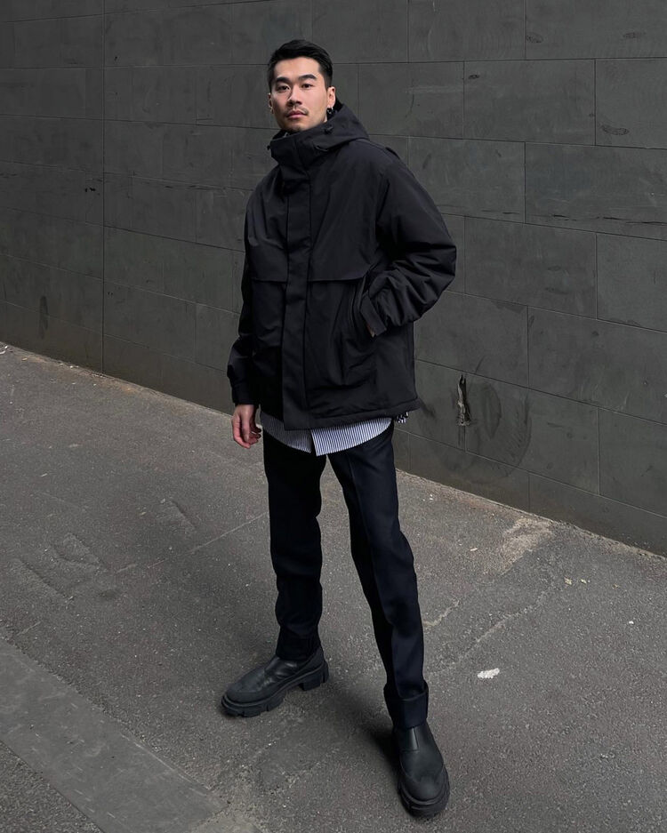 @rongjake wears the +J Hybrid Down Oversized Parka, +J Supima Cotton Oversized Long Sleeve Shirt and +J Wool Slim Fit Pants.