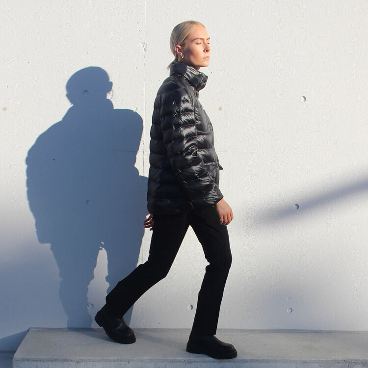 @laurennburns wears the +J Ultra Light Down Jacket, +J Silk Jersey Turtleneck L/S T-Shirt, +J Wool Silm Pants