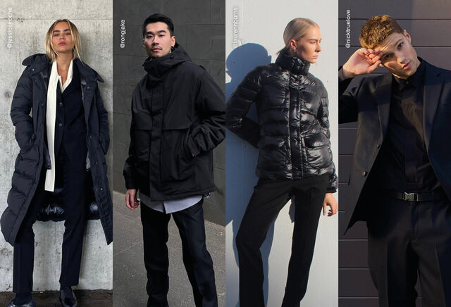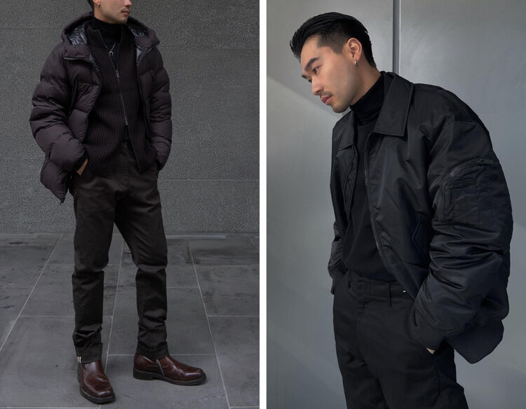 @nicktruelove wears the +J Hybrid Down Oversized Parka, +J Supima Cotton Oversized Long Sleeve Shirt and +J Wool Slim Fit Pants.