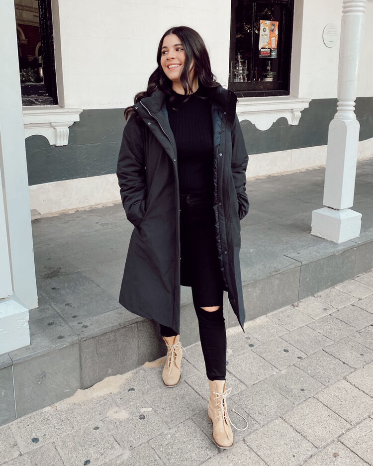 @jessraeking wears the Hybrid Down Coat.