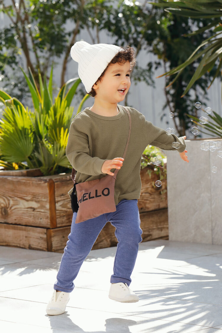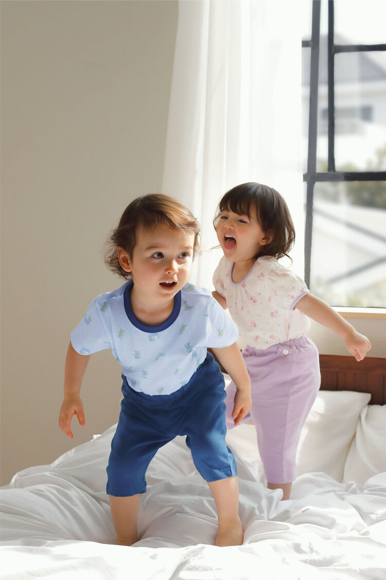 A simple t-shirt can be paired with patterned leggings. Leggings with excellent elasticity allow babies to play comfortably, whilst also allowing convenience for mum's and dad's who change their clothes often. Having multiple items of different materials and lengths allows for fun, versatile styling.