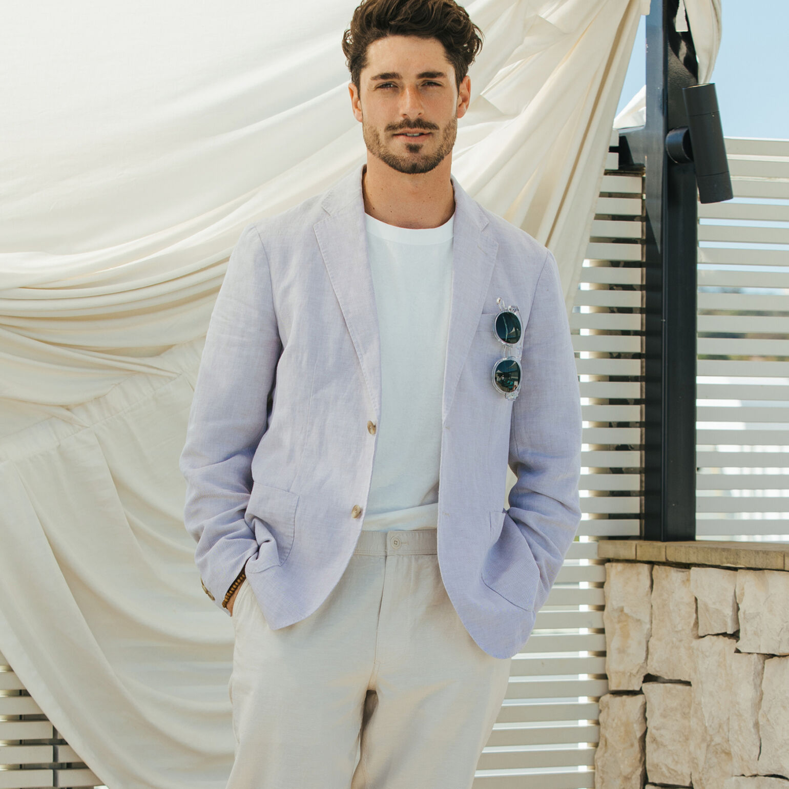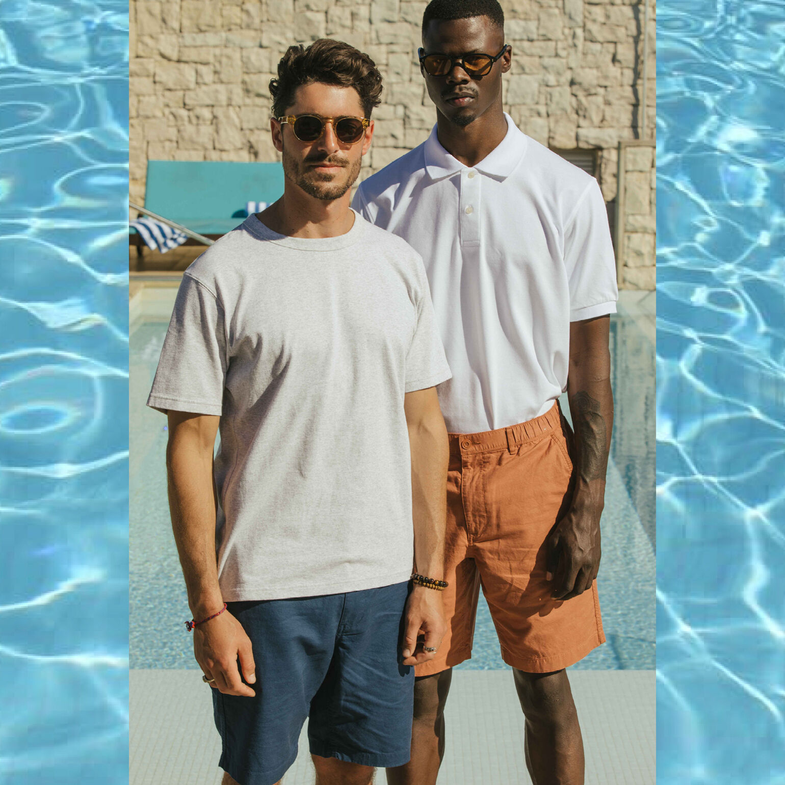 We’re heading poolside for simple style and light layering. A pastel blue or navy shirt unbuttoned over a classic white crew tee brings the desirable relaxed, holiday vibes. Speaking of navy, the linen shorts are also available in this darker tone which works really well with your choice of pastel or neutral-coloured shirts. Add your favourite pair of shades and take it easy by the water while decked-out in light linen. Footwear is optional and don’t forget your towel!
