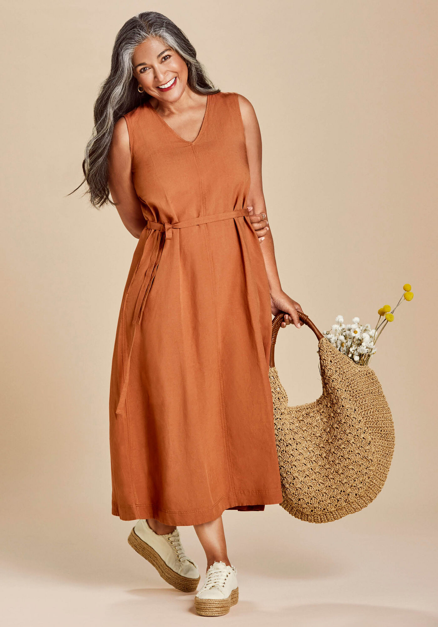 The easy and chic Linen Blend A-Line Sleeveless Dress is available in a range of on-trend, earthy tones. Simply pair with sneakers and a tote for the ultimate summer look.