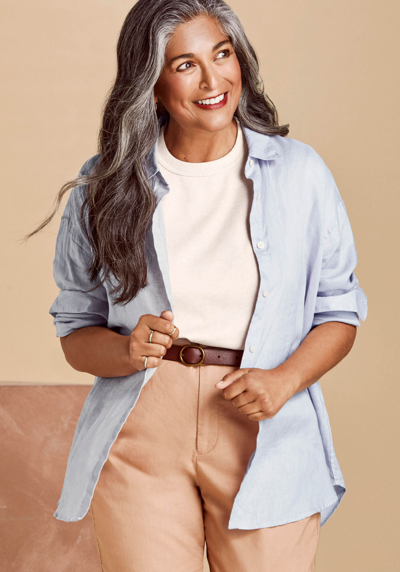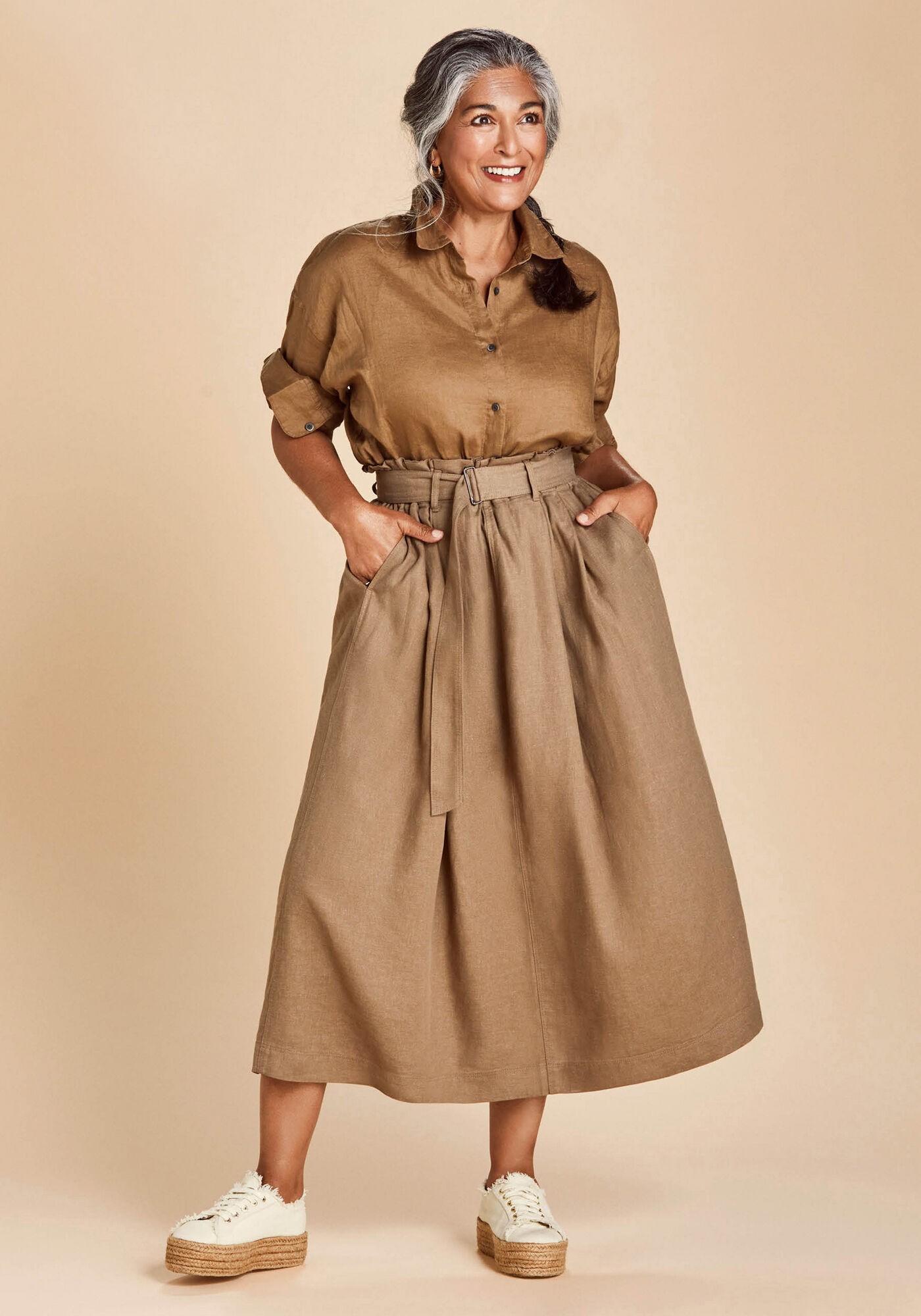 Wearing: Premium Linen Long Sleeve Shirt, Belted Linen Rayon Long Skirt