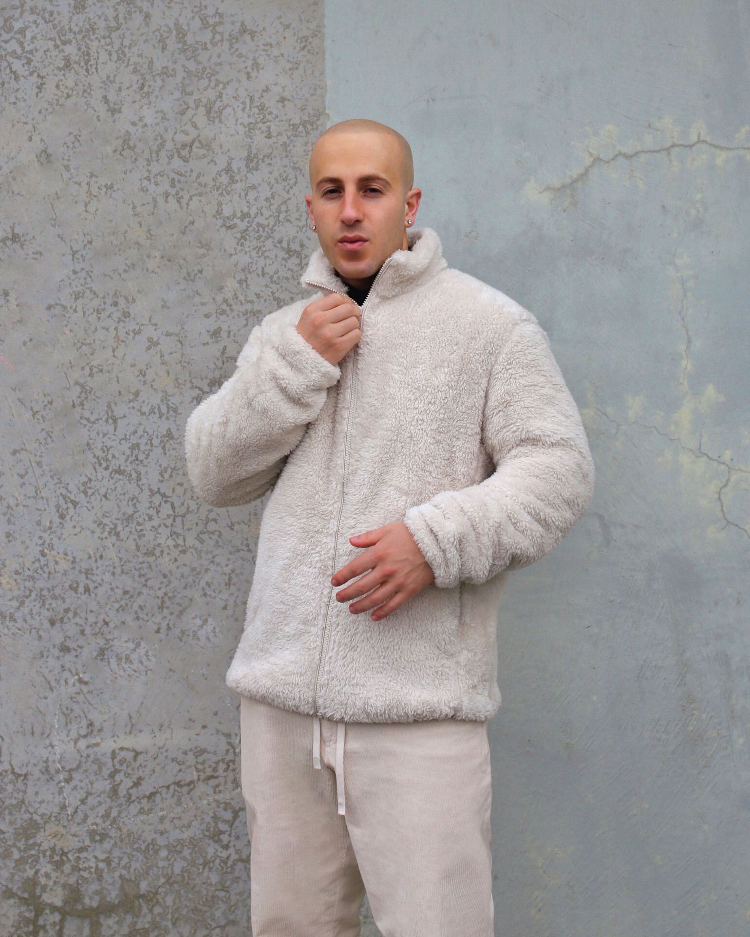 @zacwhiteee wears the Fluffy Yarn Fleece Full-Zip Jacket