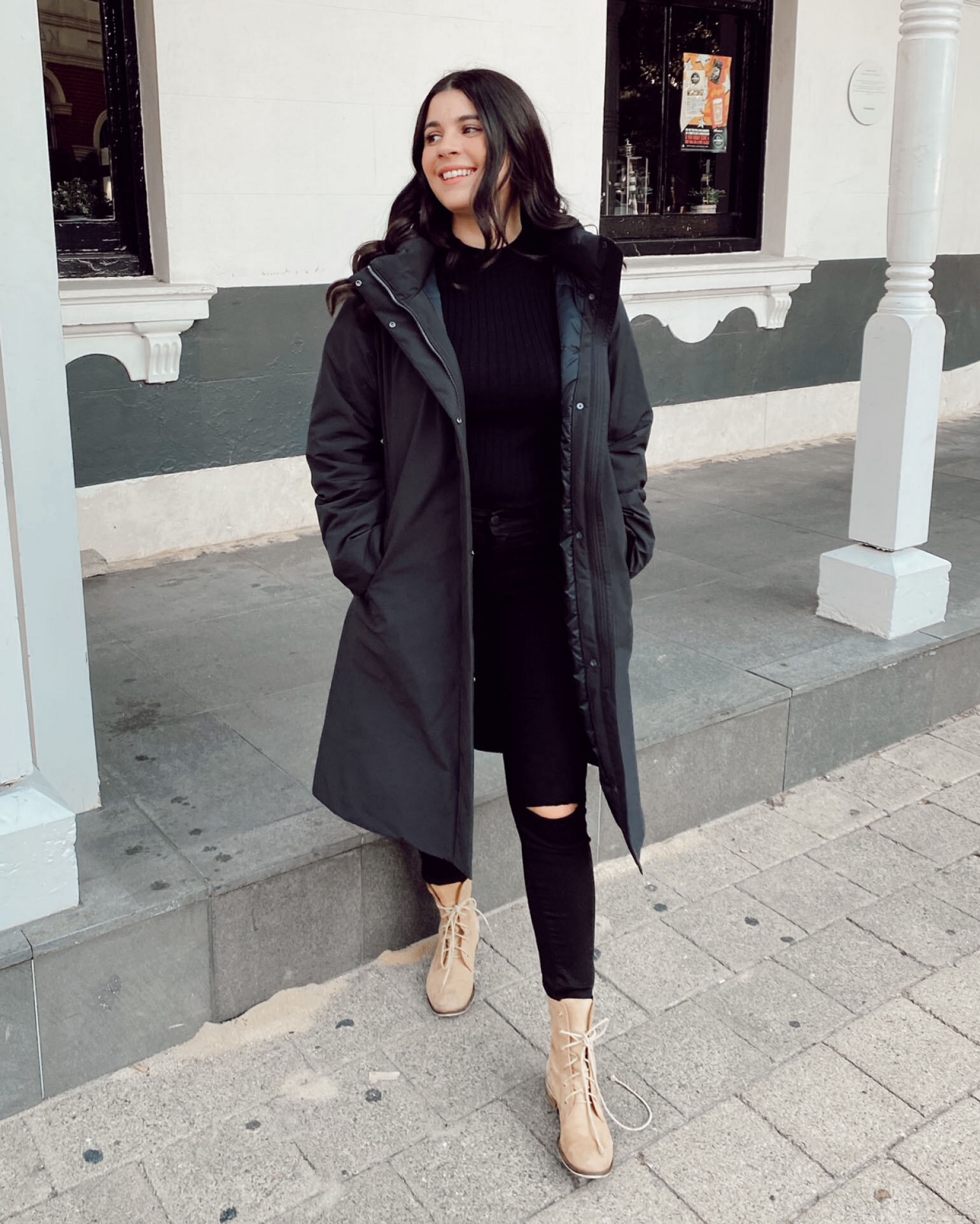 @michellebanares wears the Seamless Down Long Coat.
