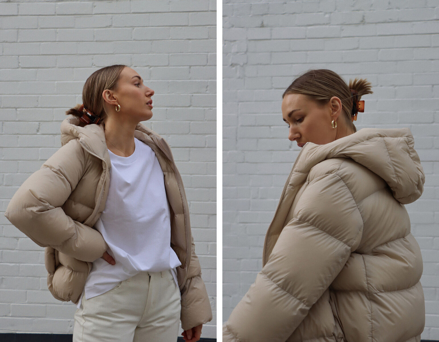 @styledbysally wears the Seamless Down Long Coat (left) and Ultra Light Down Cocoon Parka (right).