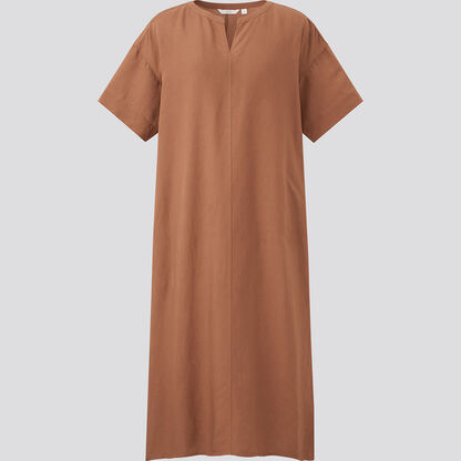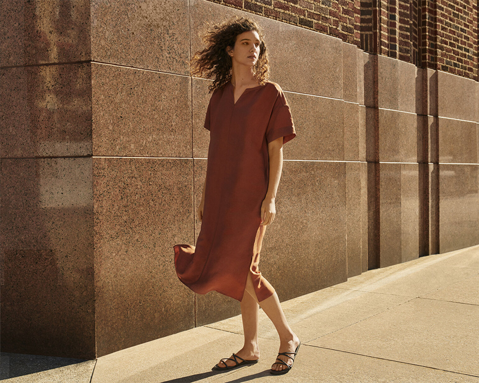 A throw-on-and-go one-piece in a blend of linen and rayon (which gives it a great, easy fit). We added tiny side slits for ease of movement and a loose short sleeve to keep you cool as you go about your day.