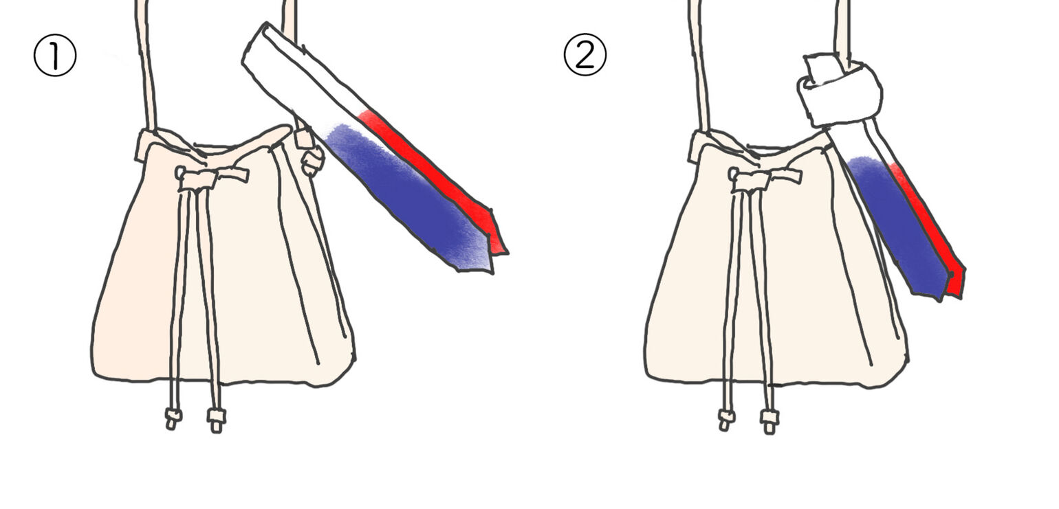 ① Fold a bias-folded scarf in half. Hang it from the handle’s base.