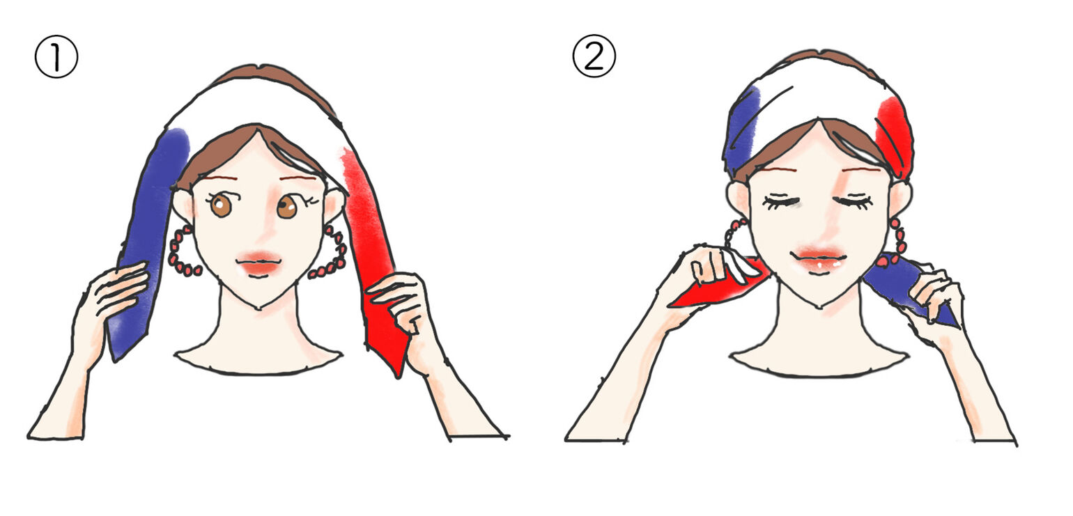 ① Set a bias-folded scarf against your nape. Bring the ends forward and cross them at the hairline at front.
