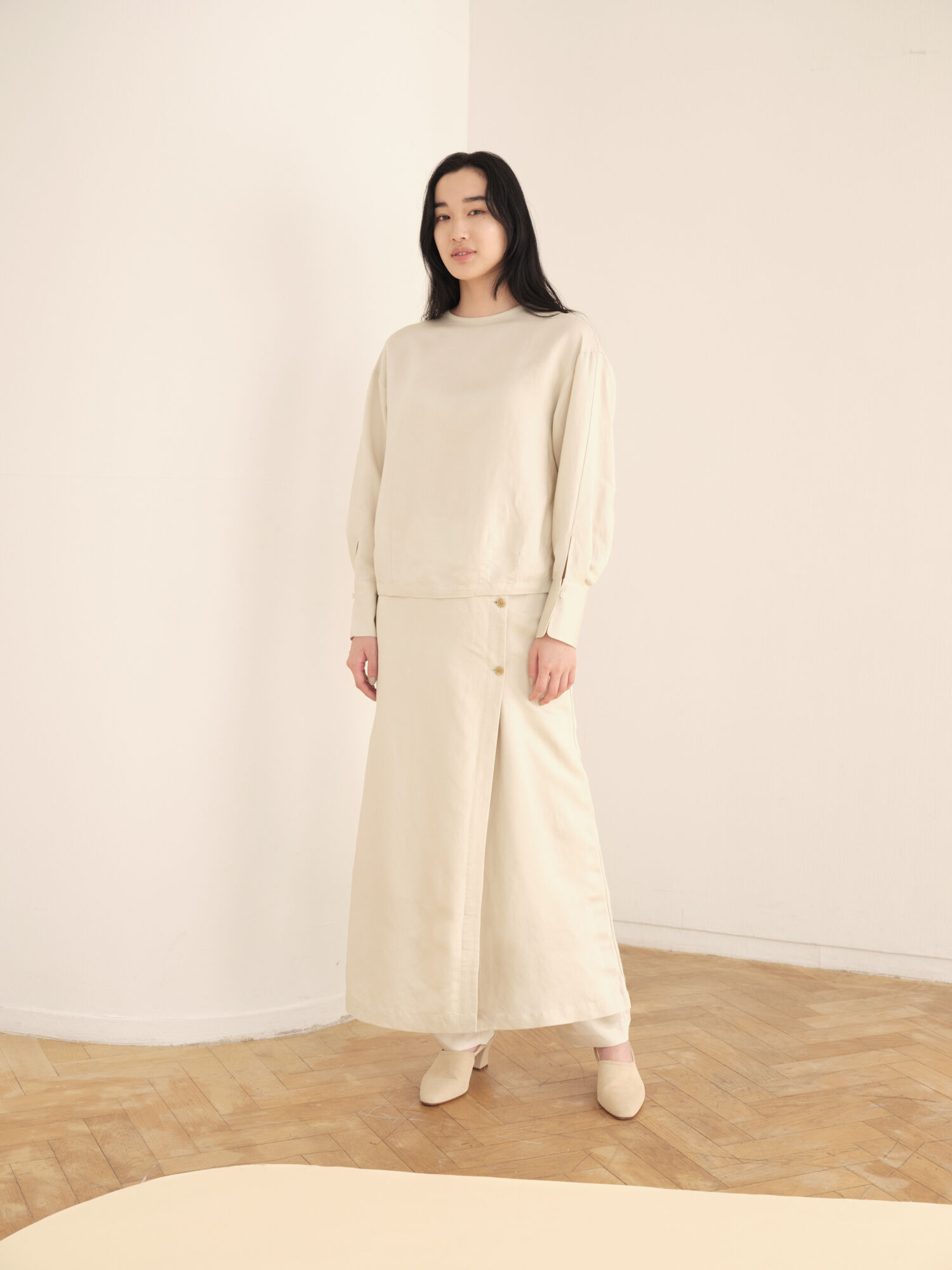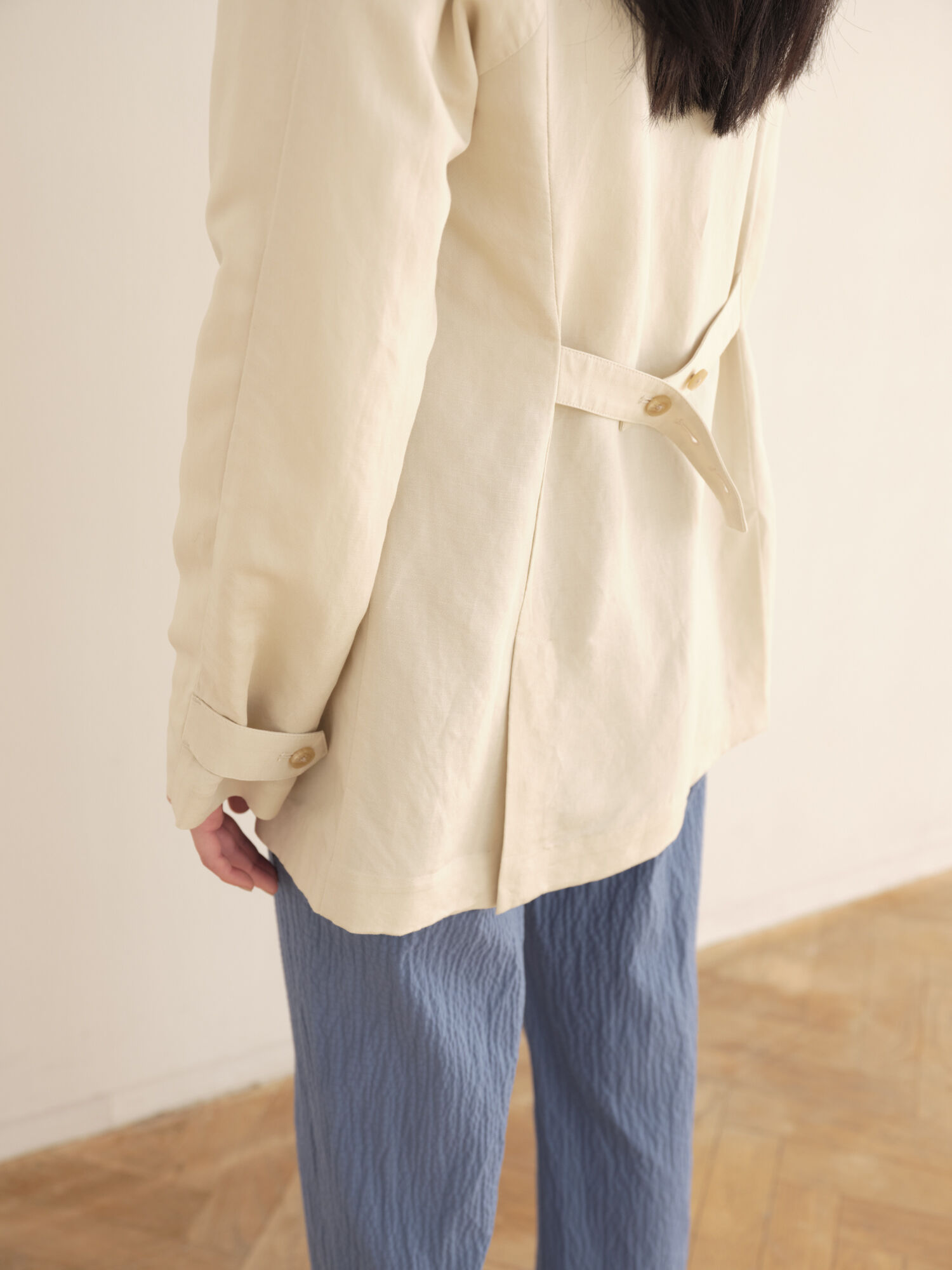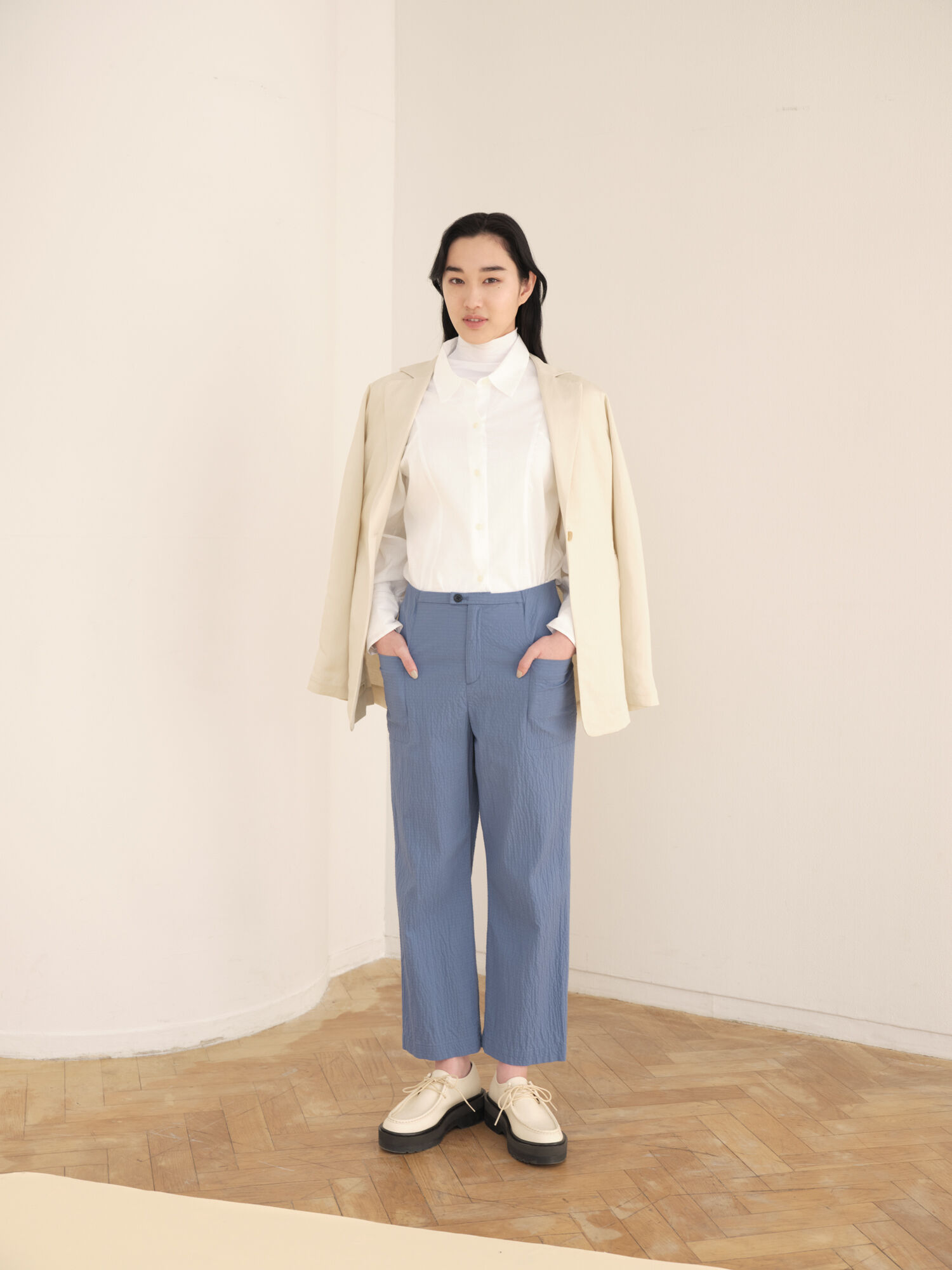 "Ramie Cotton, crafted from hemp is often rough when it is 100%, but blending it with cotton creates a softer texture. I am attracted to the sophisticated, elegant look particularly when paired with the tapered pants."
