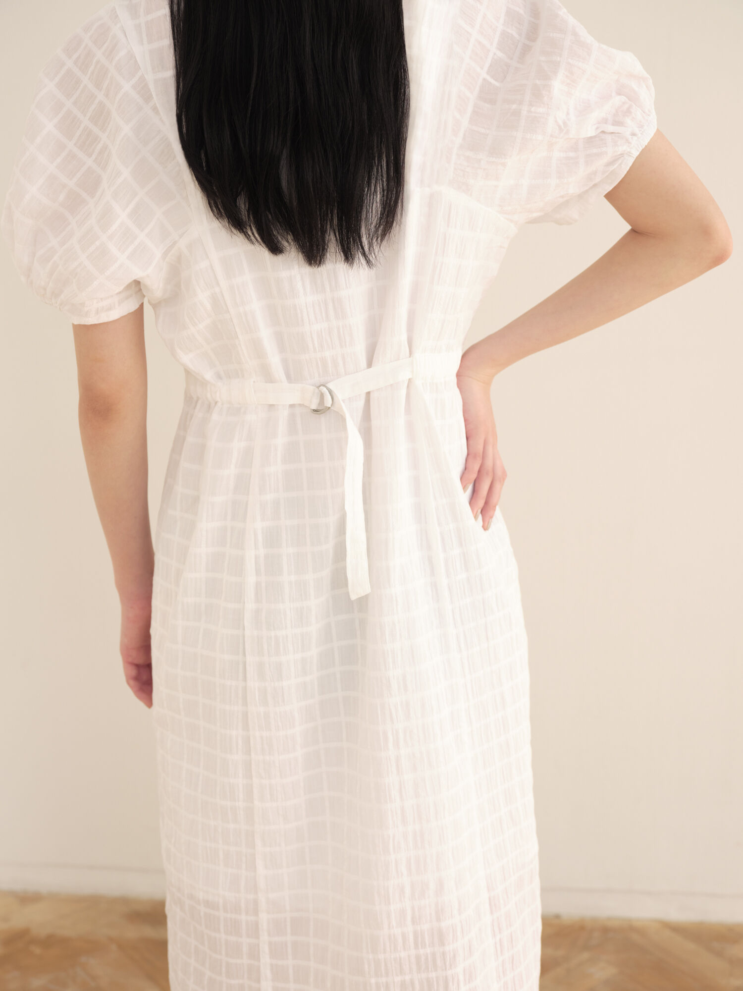 The cotton dobby used is light and airy, with an elegant woven pattern. The puff sleeves add a subtle statement for an on-trend look. Designed with an adjustable waist that can be cinched for a fitted look or loosened for relaxed styling.