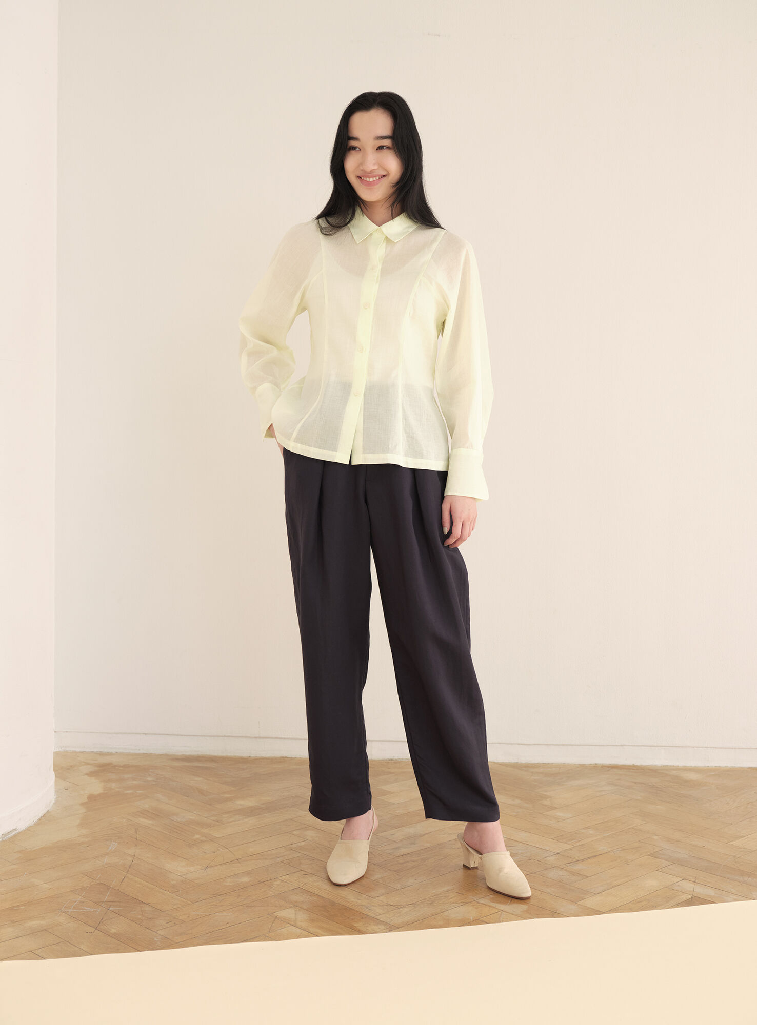 An oversized rayon x linen blended jacket offers a relaxed take on the classic coat, while still keeping it elevated from work to weekend. The transparent La's Me cotton shirt also helps to create a relaxed feeling.