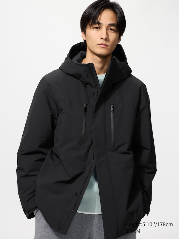 Shell: Base: 100% Polyester/ Coating: Polyurethane ( 59% Made from recycled polyester )/ Filling: Under Body: Down (Minimum 90% Grey Duck Down, 10% Small Feathers)/ Lower Body: Sides of the Item: Sleeve: 70% Polyester, 30% Viscose/ Mesh: Hood: 100% Polyester/ Lining: Body: 100% Nylon/ Mesh: 100% Polyester/ Inner Pocket Fabric: Chest Pocket Fabric: 100% Nylon/ Side Pocket Fabric: 100% Polyester/ Down Proof Fabric: 100% Polyester