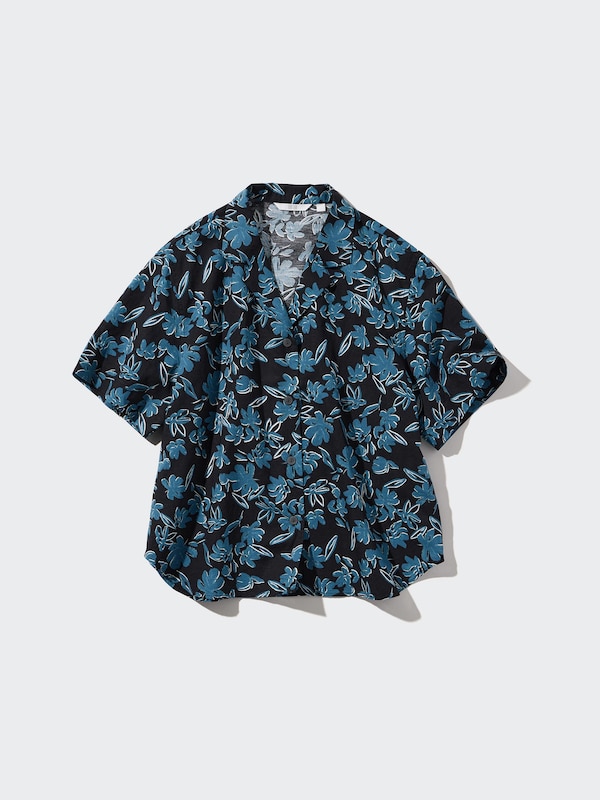 Linen Blend Short Sleeve Shirt (Print, Open Collar)