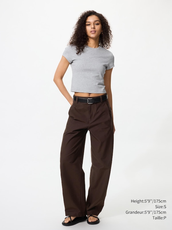 - Wide pants with a barrel silhouette.