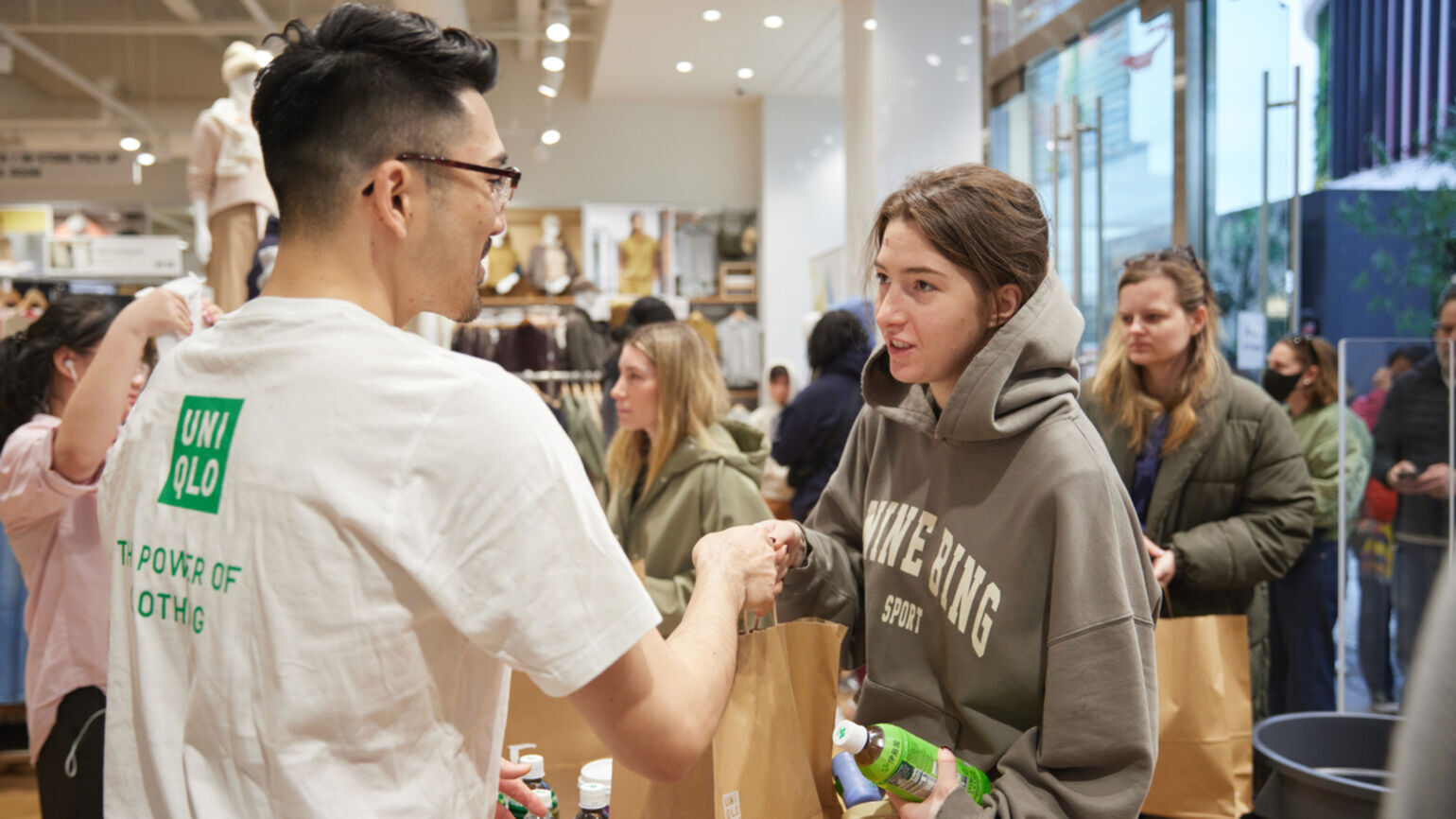 为了满足这些需要,我们准备了HEATTECH保暖内衣、袜子、运动衫等衣物,按男装、女装、童装以及不同尺码,分别装入纸袋进行发放。