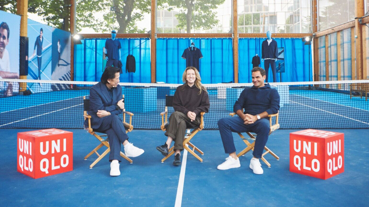 罗杰·费德勒合作系列在藏青色的网球场上进行展示,突显出该系列商品的主打色调,营造了富有特色的展示场景。身穿该系列单品的罗杰·费德勒与优衣库的品牌创意总监Clare Waight Keller一同出席了现场座谈会,分享了合作系列的灵感来源、设计中的重要细节,以及该系列的魅力所在。
