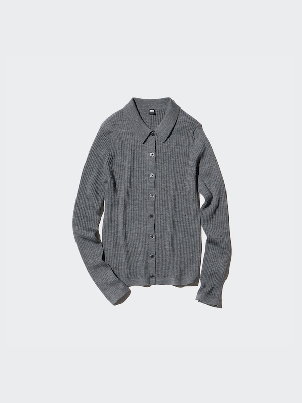 100 % Merinowolle Strickjacke (gerippt, Polokragen)