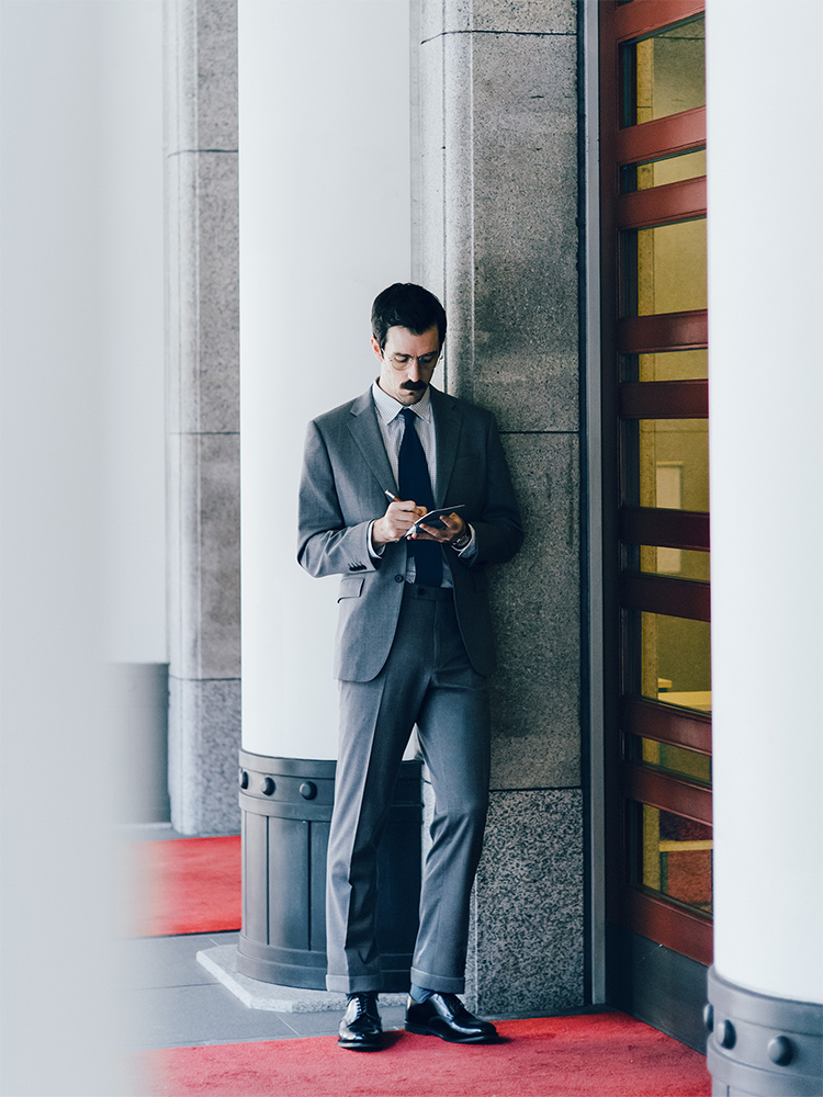 Vestido con un tradicional traje, Ben se alisó las solapas