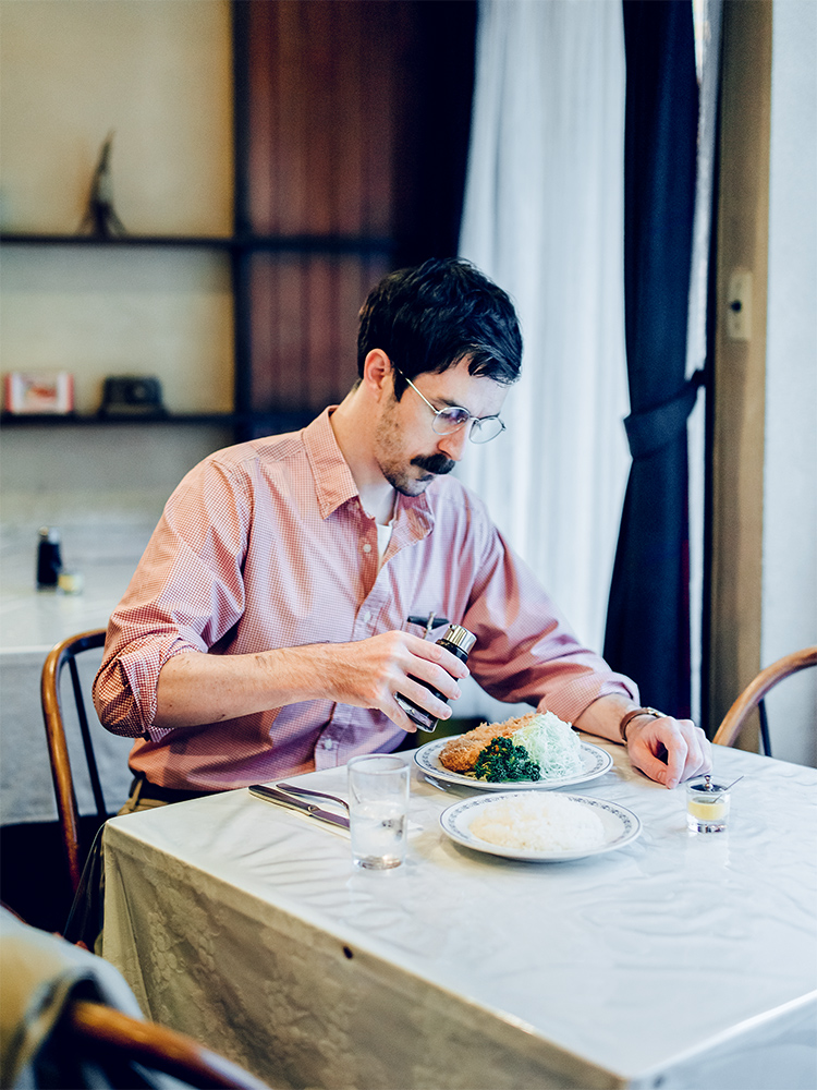 Ginza es el lugar donde comer comida occidental, al estilo japonés. En lo que respecta a los restaurantes clásicos, Rengatei tiene un ambiente relajado, por lo que Ben iba bien vestido con una camisa simple de cuadros vichy. Se dice que los platos de yoshoku más comunes, como el arroz omu y el arroz hayashi, se originaron aquí, pero empieza con su katsu de cerdo original (2000 yenes). Esta obra maestra, en la que el cerdo se fríe al estilo tradicional francés de chuleta de ternera, se disfruta mejor en las mesas junto a la ventana del piso de arriba, con una buena dosis de luz solar.