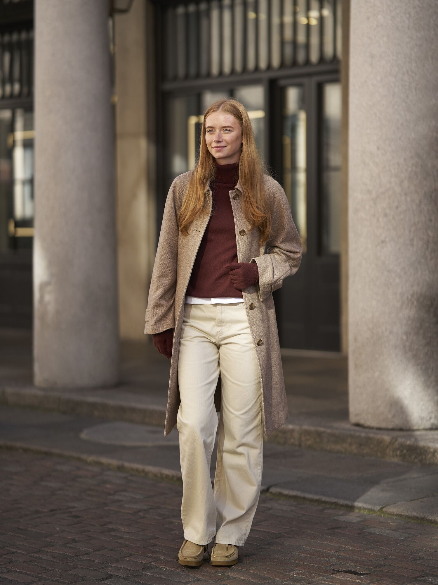 Model wears Cashmere Turtleneck Jumper, Wide Straight Jeans and Tweed Single Collar Coat.