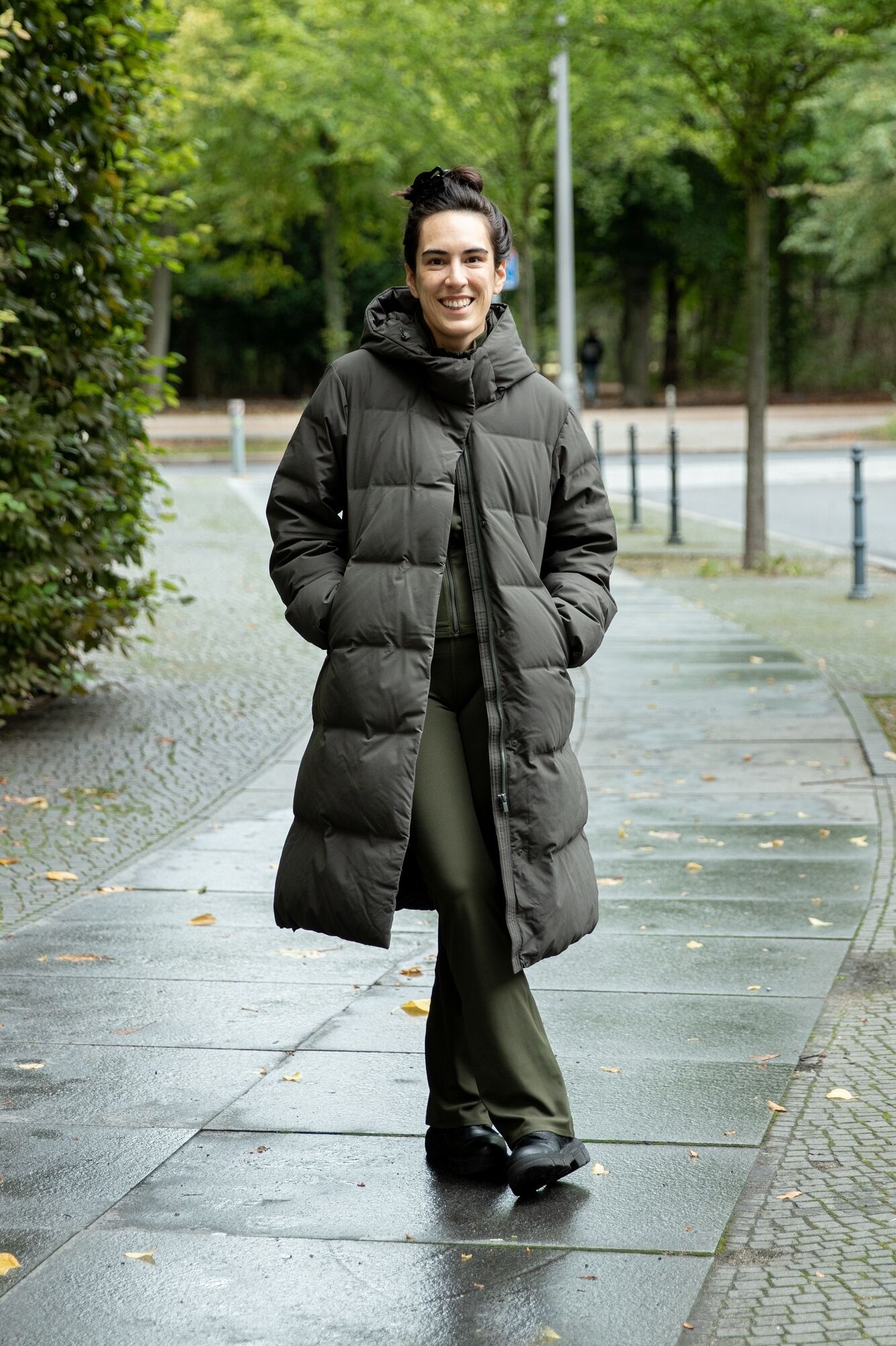 Model wears Seamless Down Long Coat and Ultra Stretch AIRism UV Protection Leggings.