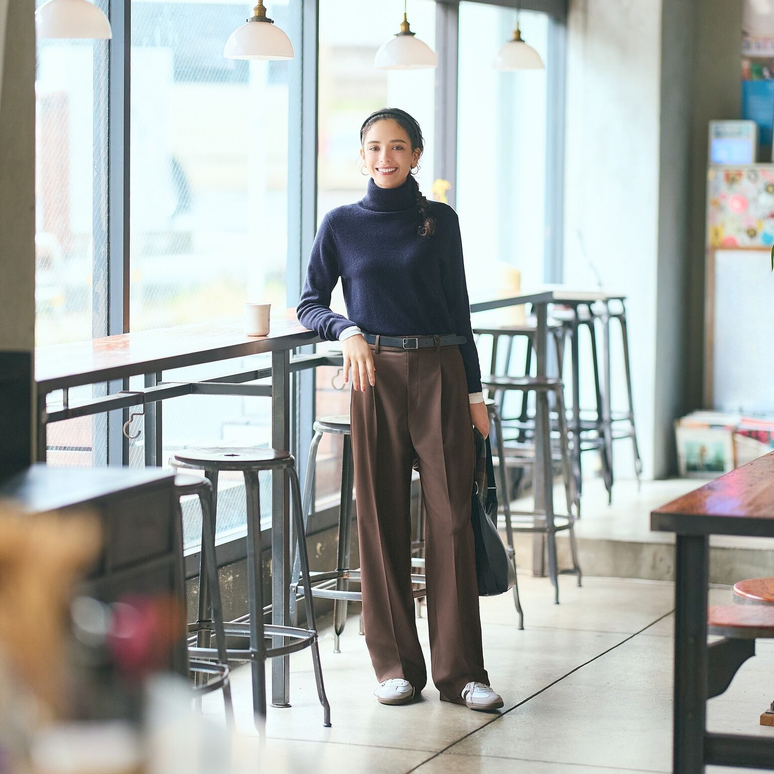 Model wears Cashmere Turtleneck Jumper, Pleated Wide Trousers and Clean Belt.