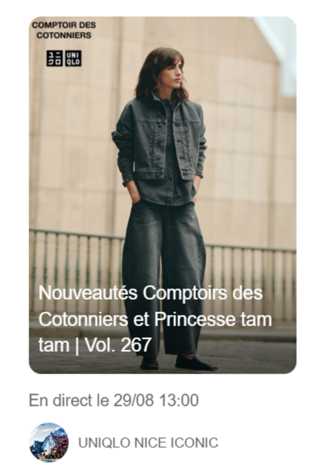 Nos équipes d'UNIQLO Nice Iconic vous donnent rendez-vous ce vendredi 29 août à 13h, pour découvrir en direct les nouvelles pièces UNIQLO and PRINCESSE tam tam. L'occasion pour vous de voir les nouveautés, poser vos questions et faire le plein de conseils.
