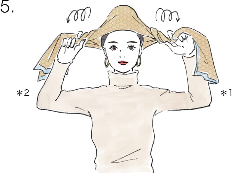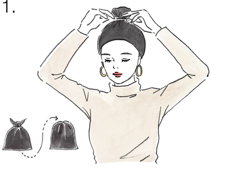 - Turn the headband inside-out and tie a knot on one end. Flip the headband back and place on your head, securing the bun from above with a hair tie. *If you are not using a headband, begin with STEP 2.