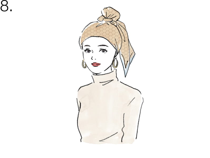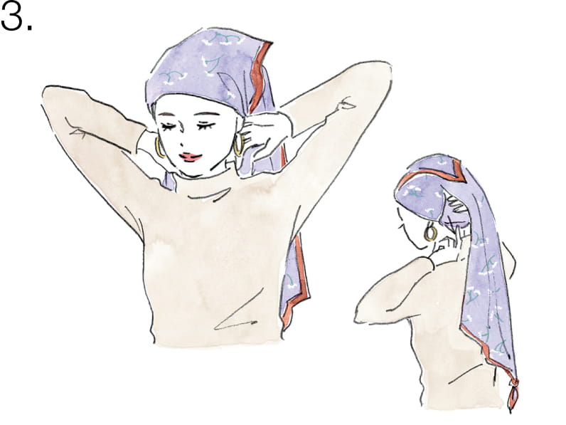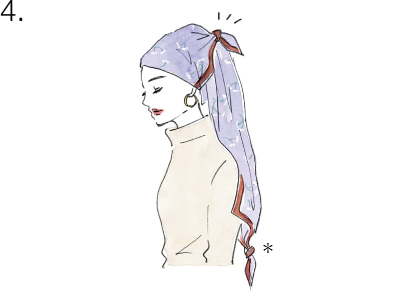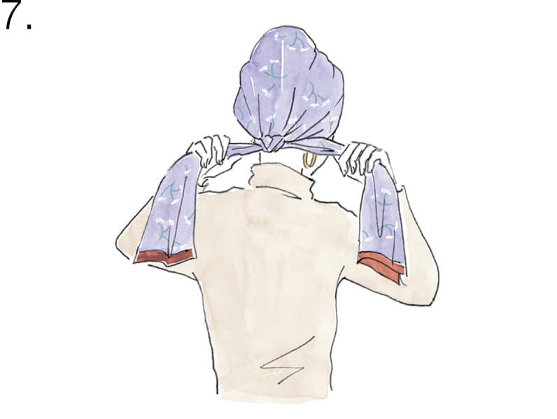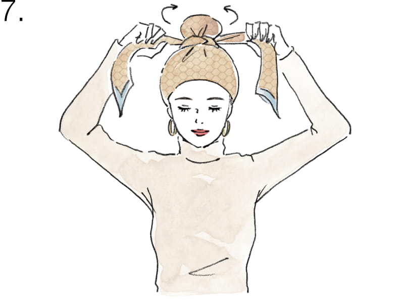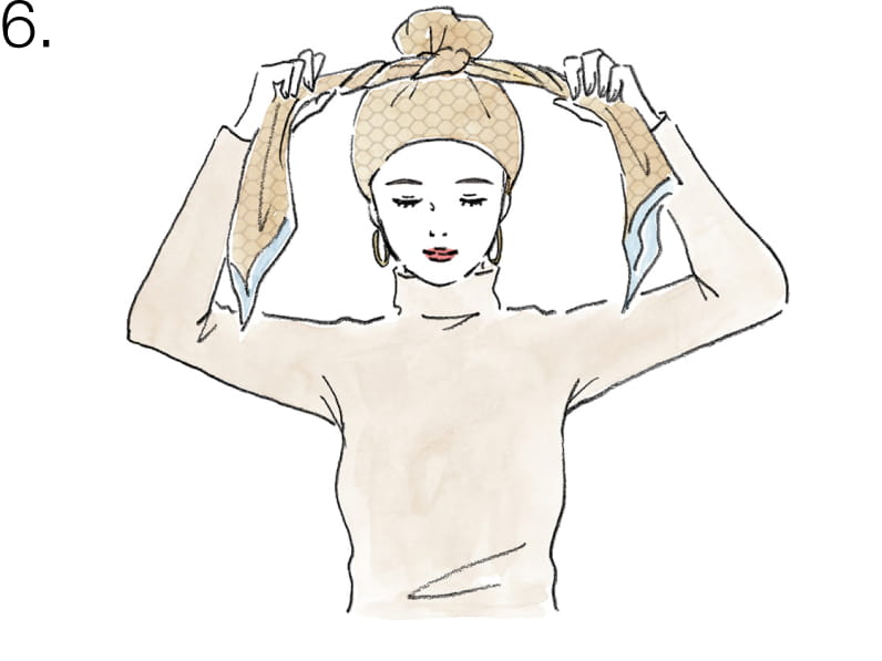 - Wrap both ends tightly around the bun and tie firmly in the back, holding the bun in place.