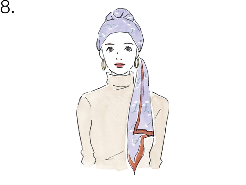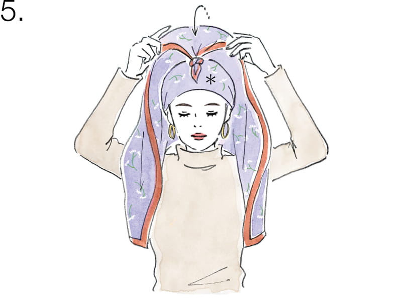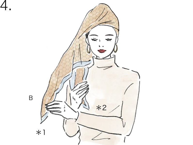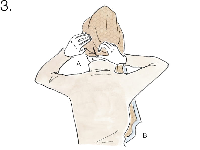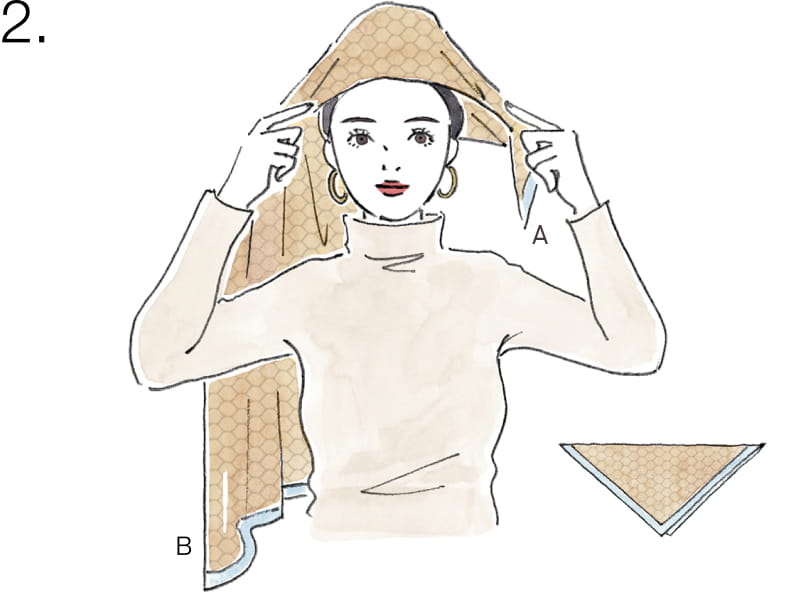 - Wrap the short end (A) behind your head, then wrap the long end (B) over it from the other side. Pin in place where the two overlap. (Tuck the short end away.)