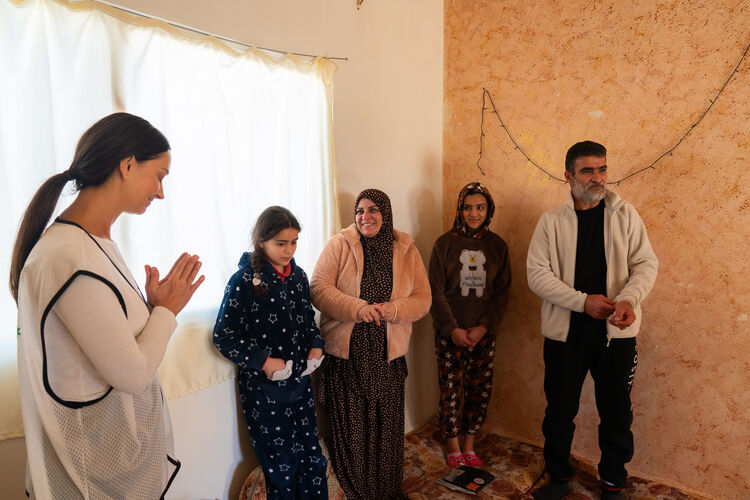 另一方面,在約旦的城市地區,還有許多人過著比難民營更為艱難的生活。為了進一步發展難民支援活動,UNIQLO與UNHCR積極參與難民的團體討論,並親自拜訪他們的家園,傾聽他們的聲音,不斷探索需求與服裝所能帶來的可能性。在這次探訪的家庭中,我們看到年久失修的房屋難以抵禦嚴寒,孩子們的教育機會有限,人道援助逐步縮減,失業問題導致貧困加劇……因病無法開口說話的父親靜靜地坐在一旁,母親則忍不住流淚,向我們訴說著這些嚴峻的現實。當她穿上我們送去的HEATTECH保暖內衣和刷毛衣物時,露出了第一次的笑容,說道:「好溫暖,真的非常感謝。」隨後,她站起來說「讓我為你們泡杯咖啡表達感謝吧。」並緊緊抱住我們,之後站在門口,不斷揮手送別我們。