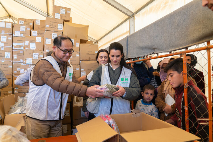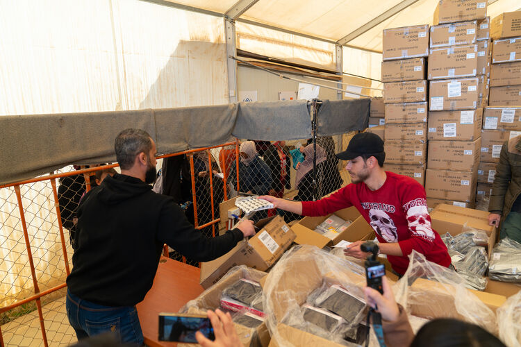前來倉庫代表家人領取HEATTECH保暖內衣的人們排成一列,由帶薪志工一一將符合家庭人口數的HEATTECH保暖內衣交到他們手中。這套高效且準確的發放運作方式,正是UNIQLO 與UNHCR長年衣物援助活動累積的成果。