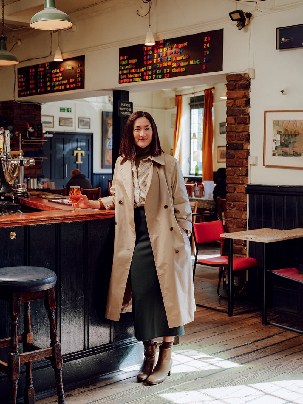 眼前這位就是Wes Anderson 電影佈景的幕後設計者 Erica,她負責《Isle of Dogs》和《The French Dispatch》兩部影片的的視覺及平面設計。她坦言,與Anderson導演合作「因為他有很高的標準,每一次都是具挑戰性的;但每次我們克服種種困難後,團隊的凝聚力都會變得更強」。電影拍攝使她經常駐留海外,工作結束後就喜歡到當地去酒吧放鬆一下。這件風衣在經典英倫風衣的基礎上做了改良,輪廓更寬鬆;由於採用了輕棉質混紡面料 ,細節更俐落,更具簡約現代感。