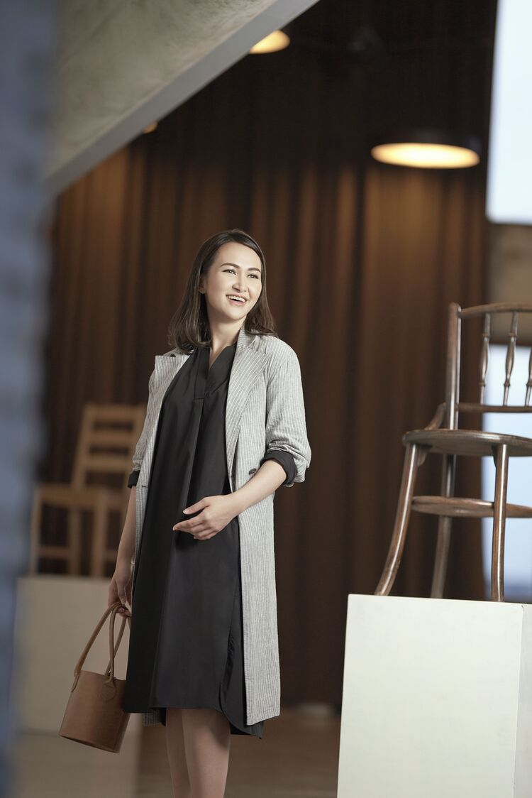 Cherry mencoba untuk tidak bermain aman pada tampilan kerja lainnya dengan mengenakan EFC Split Neck Dress berwarna hitam dengan memasangkan item ini bersama Cotton Linen Coat yang juga berkarakter supple. The result, laid-back yet chic.