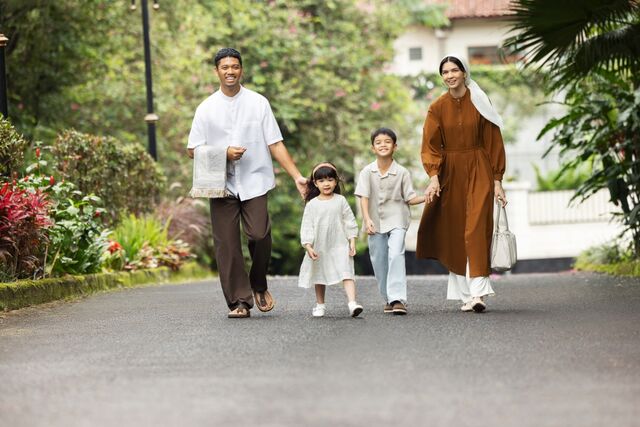 Setelah shalat, momen Hari Raya biasanya dilanjutkan dengan silaturahmi ke rumah saudara, tetangga, atau kerabat. Pilihan outfit santai yang tetap rapi cocok untuk menemani aktivitas ini.