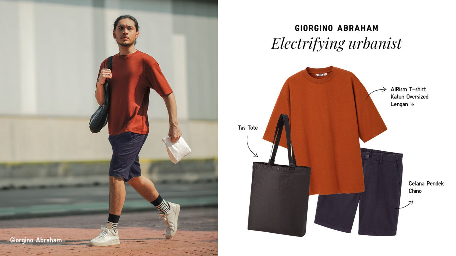 Saat meninggalkan rumah sejenak, Giorgino menggunakan momen ini untuk bereksplorasi dengan tampilannya yang berkesan adventurous dan electric. Lewat AIRism T-shirt Katun Oversized Lengan ½ berwarna dark orange: kaos bermaterial jersey yang menggabungkan benang katun dan Airism yang menjelma menjadi kain inovatif yang sejuk dikenakan saat udara hangat, berpadu dengan Celana Pendek Chino serta tambahan tas tote dan juga kaos kaki garis berwarna off-white, Giorgino menginspirasikan gaya one-mile wear yang ikonik dan juga praktikal, berkat kenyamanan dan durability dari material pakaian yang dikenakan.