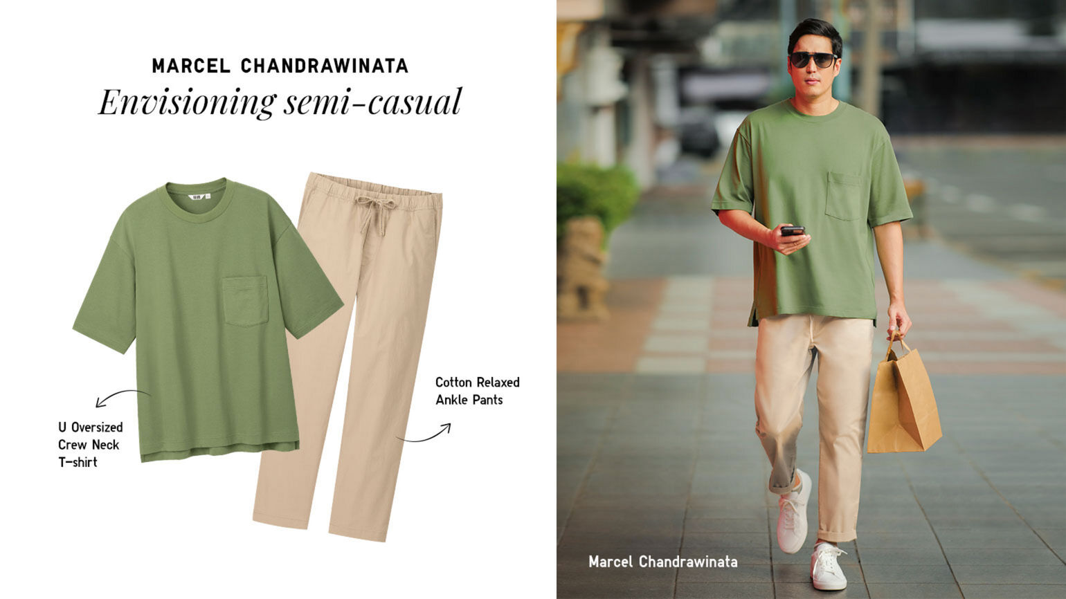 Marcel mengunggulkan tampilan typical-nya yang cenderung bernuansa mature. U Oversized Crew Neck T-shirt berwarna olive yang merupakan pilihan ideal untuk bentuk tubuh Marcel yang semampai, ia pasangkan dengan Cotton Relaxed Ankle Pants berwarna beige dan sneakers berwarna putih. Gaya kasual berkelas khas perkotaan besar.