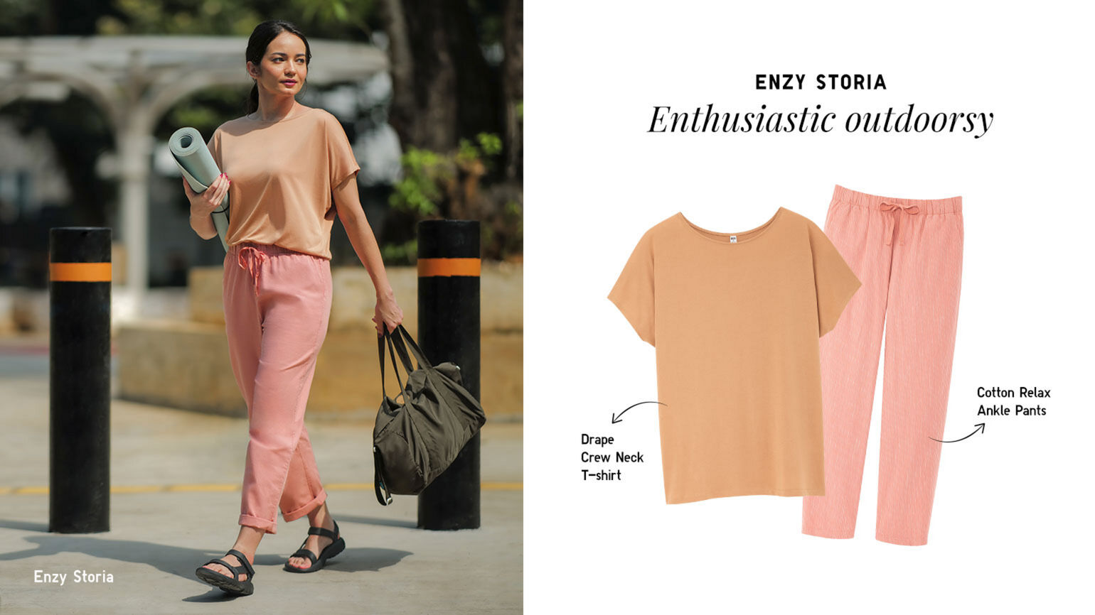 Subtle namun juga enerjetik. Enzy yang banyak menghabiskan waktu di rumah dengan yoga, menggemari pakaian dengan material yang terasa lembut dan sejuk di kulit. Drape Crew Neck T-shirt yang menggunakan material berkarakter tipis namun elegan, membuat T-shirt ini tetap terlihat penuh gaya dengan gaya styling apa pun. Enzy memadukan T-shirt berwarna beige pilihannya dengan Cotton Relax Ankle Pants dengan pinggang bermodel draw string dalam nuansa serupa, yang terlihat ideal saat ditumpu dengan outdoor sandals sebagai keseluruhan tampilan one-mile wear yang chic.