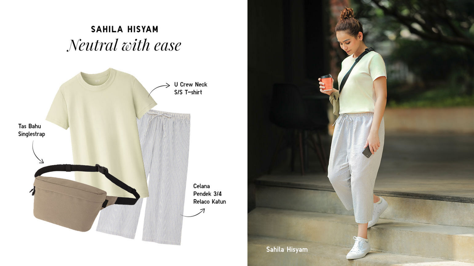 Nuansa neutral undertone menemani momen coffee bound Sahila yang memilih tampilan sporty lewat perpaduan U Crew Neck S/S T-shirt dan Celana Pendek 3/4 Relaco Katun beraksen motif joy of print. Sahila yang menggemari gaya sleek memilih memakai T-shirt dengan cara dimasukan sehingga mengekspos keunikan celana, yang mengubah tampilan basic ini terlihat distingtif. Tennis sneakers dan crossed-body bag hadir sebagai aksesori yang memberi modern twist pada tampilan minimalis Sahila.