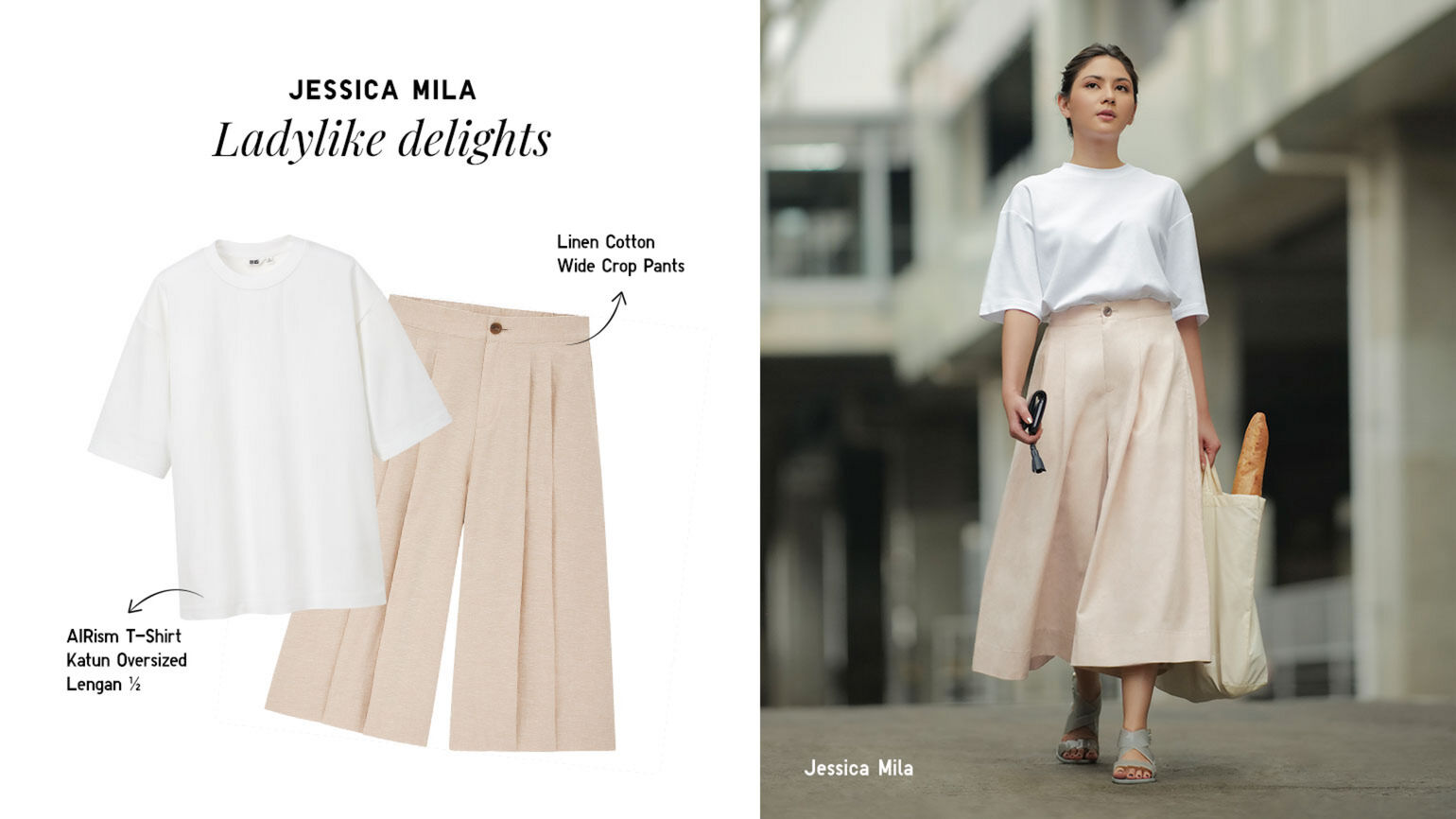 Linen Cotton Wide Crop Pants memberi sebuah “mood” yang menarik perhatian saat dikenakan untuk berbelanja groceries. One-mile wear berkesan flirty direalisasikan oleh Jessica Mila yang memasangkan item ini dengan AIRism T-Shirt Katun Oversized Lengan ½ yang merupakan T-shirt koleksi pria, namun kompatibel untuk wanita, sehingga nuansa maskulin juga terasa sebagai penyeimbang dari celana dan figur Jessica yang cenderung girly. Strappy sandals menjadi penyelesaian yang manis untuk tampilan netral namun brilian ini.