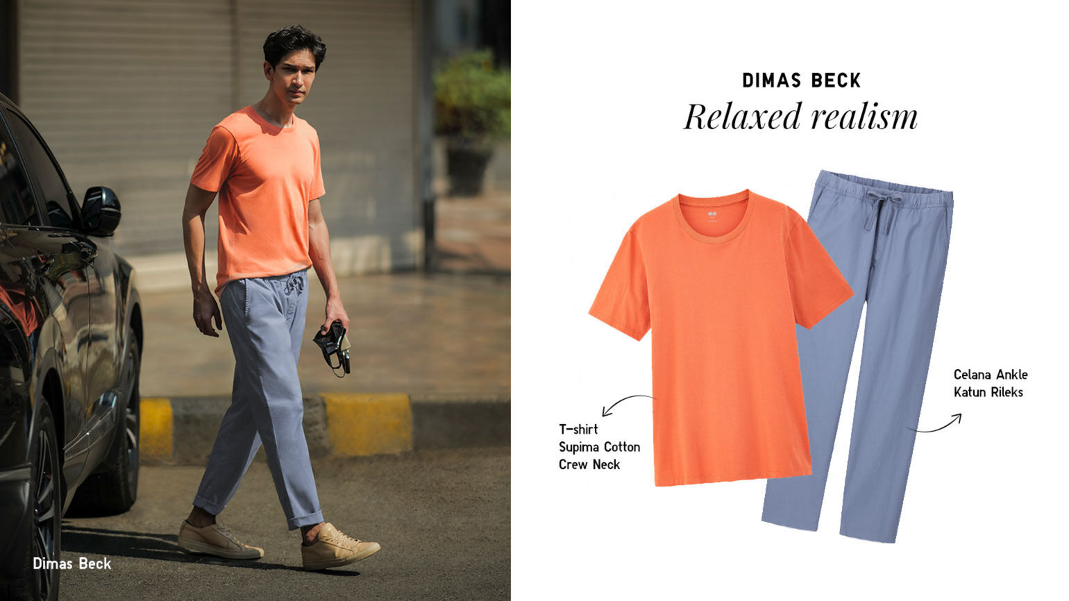 Kenyamanan pakaian untuk berbagai aktivitas terutama jika harus berkegiatan di luar ruangan, tetap diprioritaskan Dimas Beck. Oleh karena itu, perpaduan antara T-shirt Supima Cotton Crew Neck yang extra smooth dengan potongan longgarnya yang nyaman, serta Celana Ankle Katun Rileks dengan siluet terbaru yang menambahkan kesan clean pada tampilan serta juga bagian pinggang celana yang elastis, menjadi pilihan Dimas yang memilih warna vivid pada kedua item andalannya tersebut.